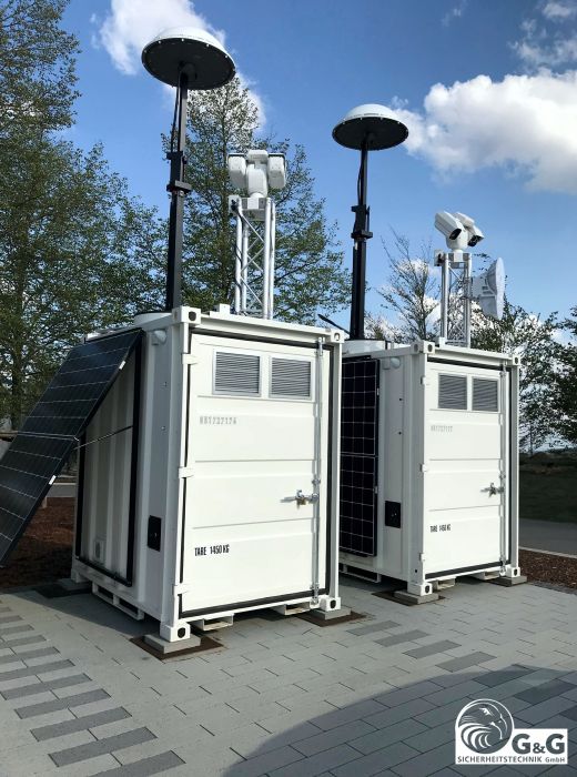 Hauseigene Entwicklung und Produktion - made in Germany Mit dem G&G Videocontainer haben wir die Videoanalyse, sprich die Unterscheidung von Objekten in Mensch, Fahrzeug und Tier, zum mobilen Instrument gemacht. Lückenlose Überwachung Durch die 360° Rundumanalyse überwacht das System im Radius von ca. 120 Metern alle Bewegungen und Einflüsse rund um die Uhr. Selbsttätige Auslösung von Alarmen Alarmereignisse werden in Echtzeit via Mobilfunknetz oder Satellit übertragen. Parallel zur Fernalarmierung erfolgt ein Alarmsignal oder eine Sprachdurchsage vor Ort mit 113dB bei 1W/1m. Eigene Energieversorgung Eine eigene Energieversorgung durch Akkupufferung in Verbindung mit Photovoltaik und Dieselstromerzeuger (alternativ mit Brennstoffstelle) gewährleisten einen zuverlässigen Betrieb.