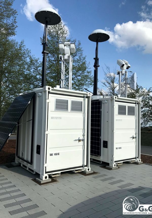Hauseigene Entwicklung und Produktion - made in Germany Mit dem G&G Videocontainer haben wir die Videoanalyse, sprich die Unterscheidung von Objekten in Mensch, Fahrzeug und Tier, zum mobilen Instrument gemacht. Lückenlose Überwachung Durch die 360° Rundumanalyse überwacht das System im Radius von ca. 120 Metern alle Bewegungen und Einflüsse rund um die Uhr. Selbsttätige Auslösung von Alarmen Alarmereignisse werden in Echtzeit via Mobilfunknetz oder Satellit übertragen. Parallel zur Fernalarmierung erfolgt ein Alarmsignal oder eine Sprachdurchsage vor Ort mit 113dB bei 1W/1m. Eigene Energieversorgung Eine eigene Energieversorgung durch Akkupufferung in Verbindung mit Photovoltaik und Dieselstromerzeuger (alternativ mit Brennstoffstelle) gewährleisten einen zuverlässigen Betrieb.